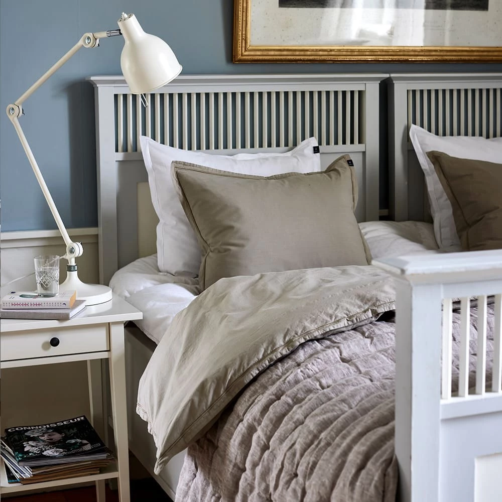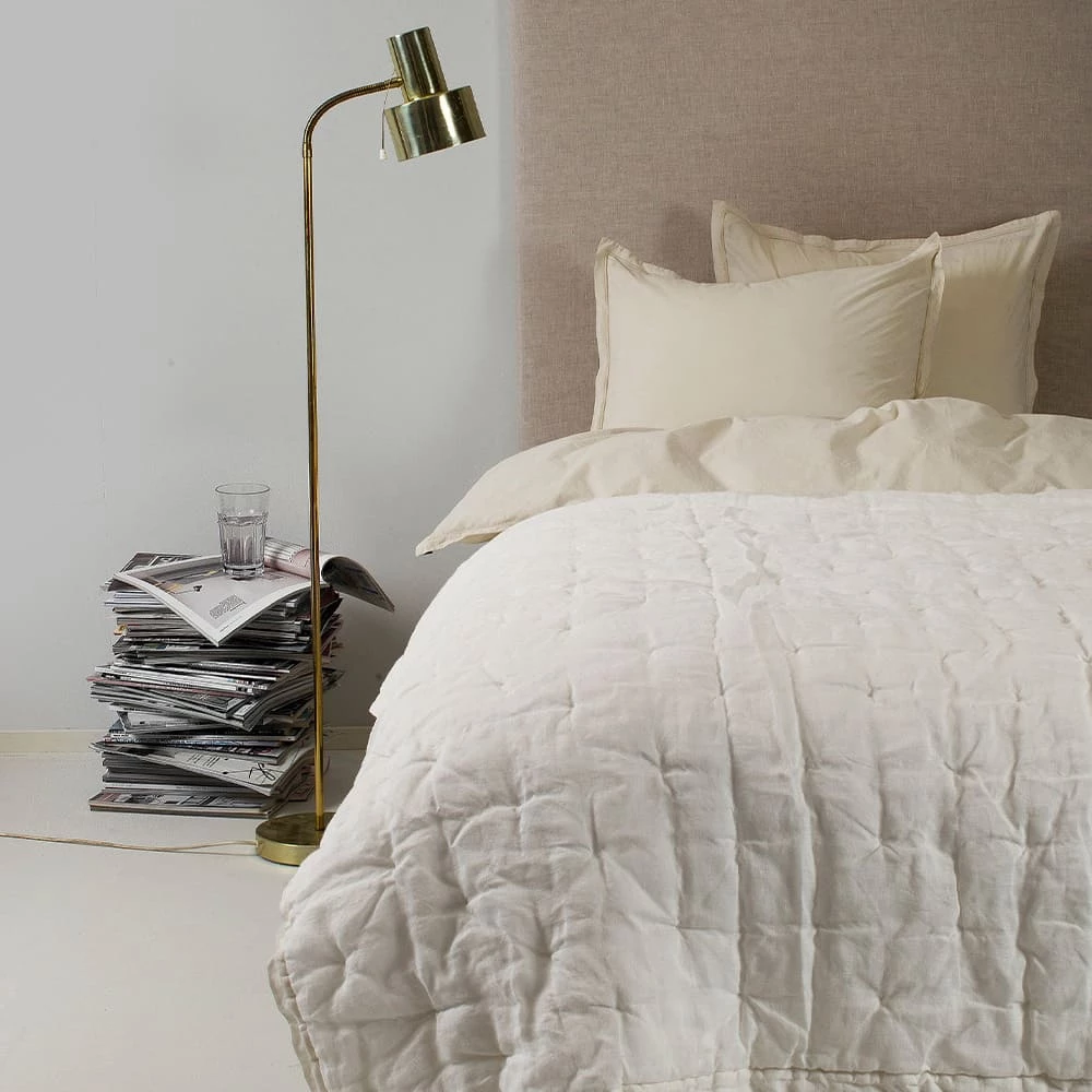 Carlin är vårt quiltade överkast i tvättat linne. Framsida i garnfärgat, melerat lin med diskreta broderade prickar. Baksida i matchande bomullspercale och inuti en lätt polyester vaddering. Kanterna pryds av en 3 cm bred, dekorativ bård runtom.