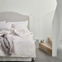Påslakanet Satina från Mille Notti har en stilren design med en silkeslen känsla. Den förgyller ditt sovrum och blir lätt en tidlös favorit. Tyget får en fin lyster tack vare sin höga trådtäthet, 340 TC. Bomullen är dessutom finkammad för en extra mjuk känsla. Förslutningen med knytband nedtill ger dessutom en extra vacker känsla till bäddningen.